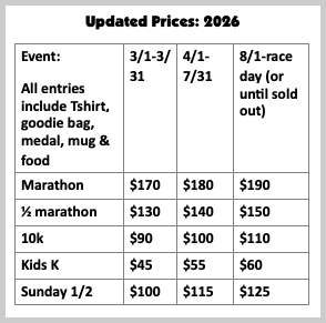 Entry Fees: Entry fees range between $45 and $190 depending on the race distance and date you register. Click here for price chart with dates & distances.
