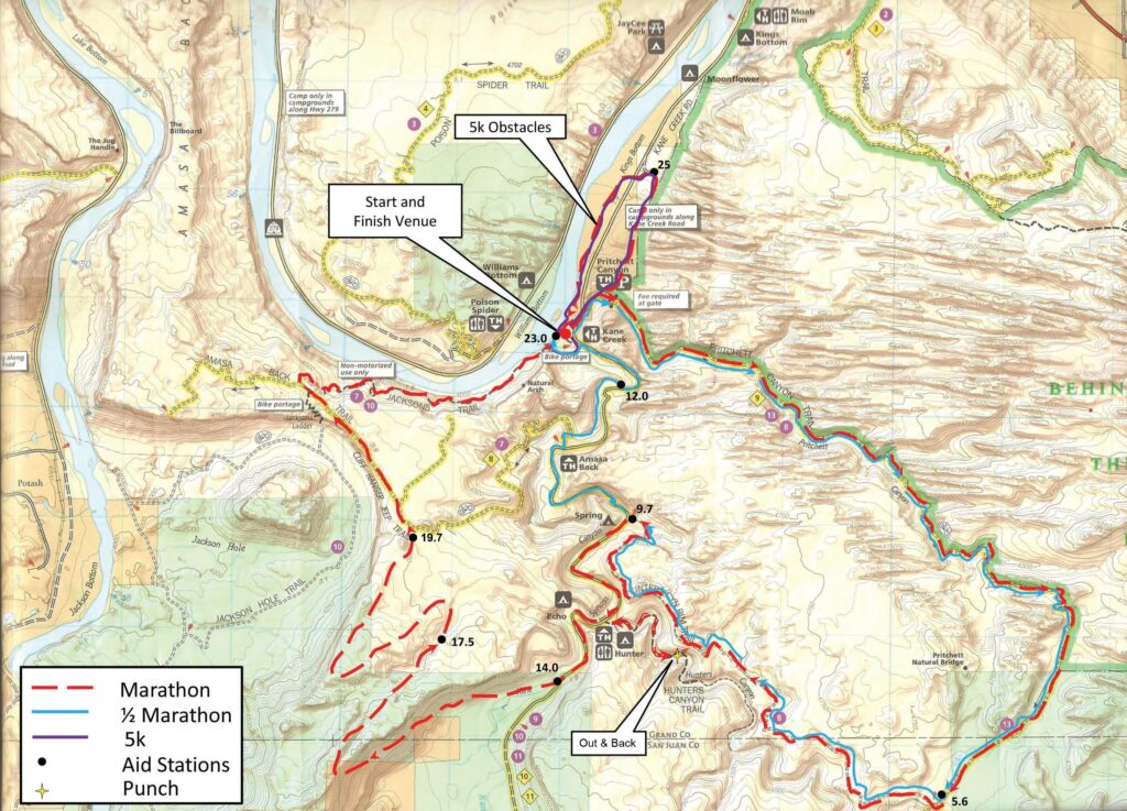 ½ Marathon: Start at the Pritchett Canyon entrance, proceed up Pritchett Canyon trail (5.7 miles) connecting to Hunter Canyon Rim trail (1.8 miles), proceeding along the Hunter Canyon Rim single-track and down to Kane Creek Road (2.2 miles). Turn right and continue up the infamous Kane Road switchbacks for about a mile, then back down to the Hymasa singletrack into the depths of Kane Creek drainage. Continue for 1 mile in the drainage, exiting at the Amasa Back parking lot for another ½ mile dirt road before the final ½ mile of singletrack with two crossings of Kane Creek before the finish.